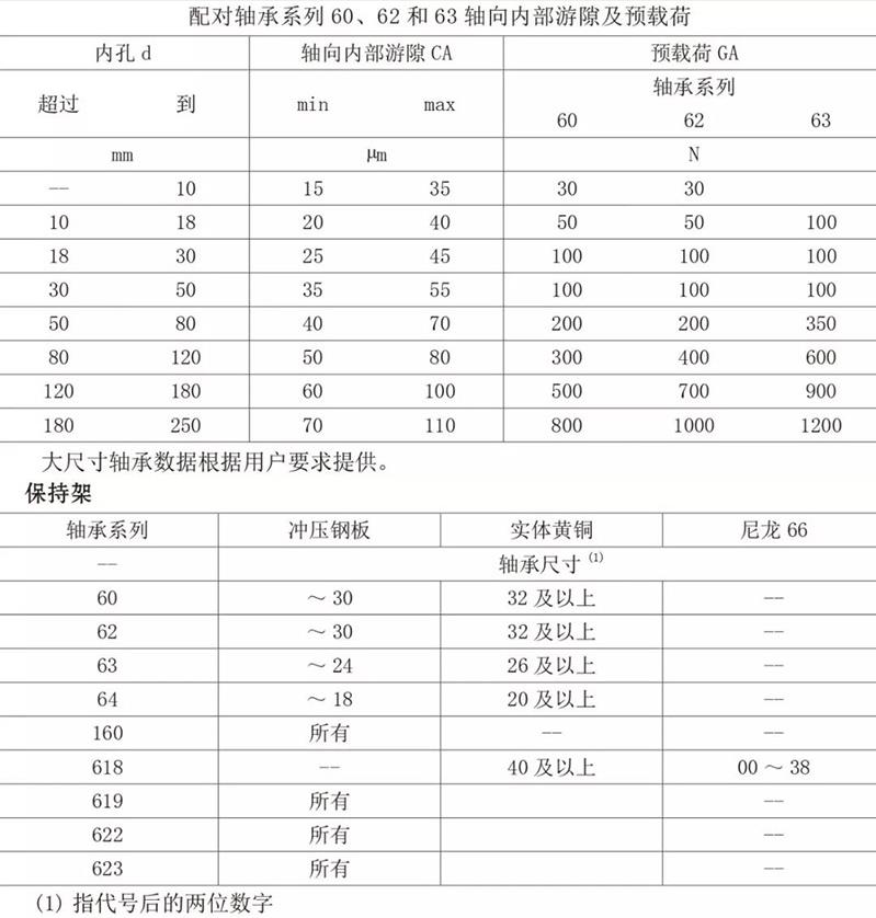 普通級(jí)深溝球軸承具有 C0組游隙,也可提供大于或小于普通級(jí)游隙的產(chǎn)品。雙列深溝球軸承具有普通級(jí)徑向游隙,背靠背或面對(duì)面組合軸承一般以下列兩種形式供貨較小的軸向游隙,后置代號(hào) CA,輕型預(yù)壓,后置代號(hào) GA,60、62 和 63 系列。